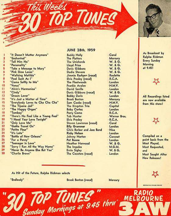 For Melbourne station 3AW in 1959 the chart was compiled on a point basis from the most played, most requested, and most sought after new releases. ("Most sought after" sounds especially rubbery. See also my blogpost 3AW creates a chart.)